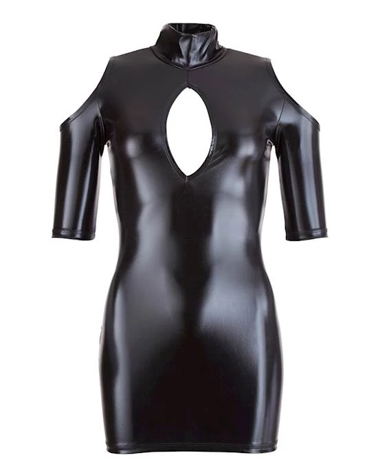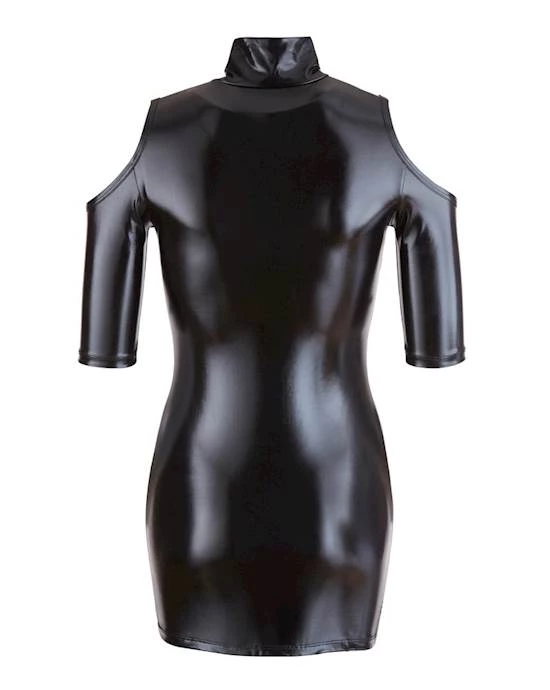 This black mini dress with stand-up collar and short sleeves impresses with free shoulders and a refined neckline on the cleavage. The matte, glossy wetlook material fits snugly and accentuates your luscious curves in an elegant and seductive way.