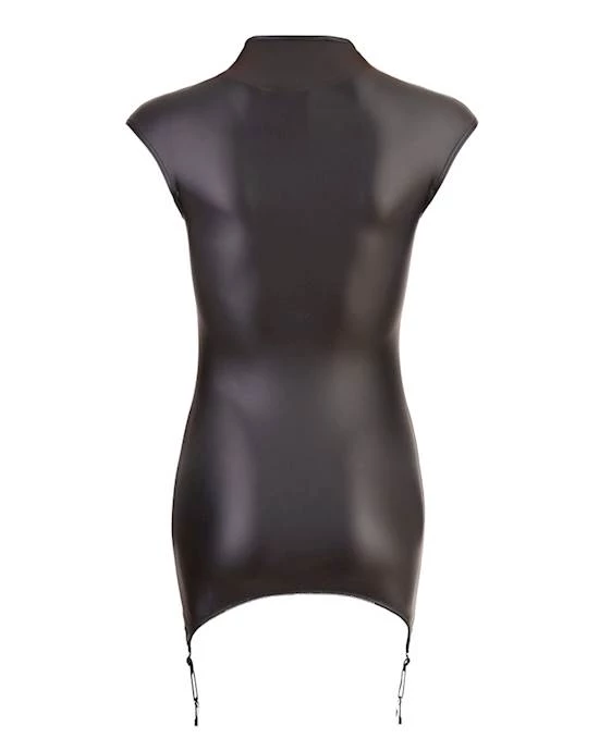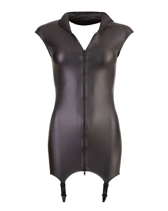 Enjoy erotic moments when you wear this suspender dress. The high-necked and sleeveless mini dress made of matte-gloss fabric impresses with its two-way zipper at the front and the four sewn-on suspenders.