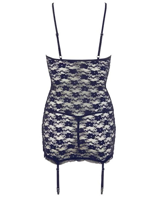 Cut & material: Suspender dress made of semi-transparent floral lace with a small ruffle on the hem. With adjustable straps and 3 pink decorative bows on the front. A lace string is also included in the set.