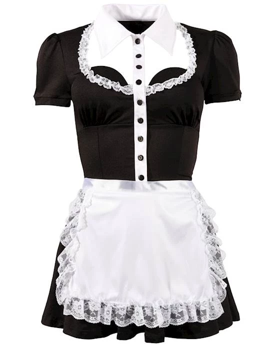 Cut & material: dress with collar, button placket and ruffles on the cleavage. Including apron, to be tied at the back. Dress 90% polyester, 10% elastane; 100% polyester apron.