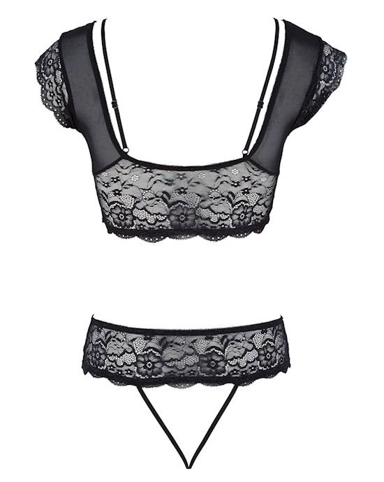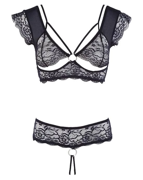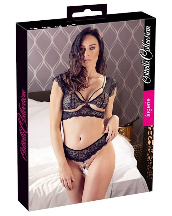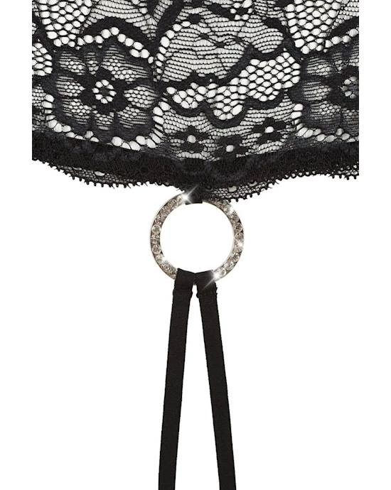 The matching G-string has a wide lace waistband and is almost completely open in the crotch area allowing for easy access to your most intimate areas. There are only 2 stretchy straps over the crotch that are attached to rhinestone ring above the pubic area.