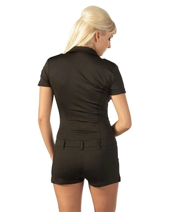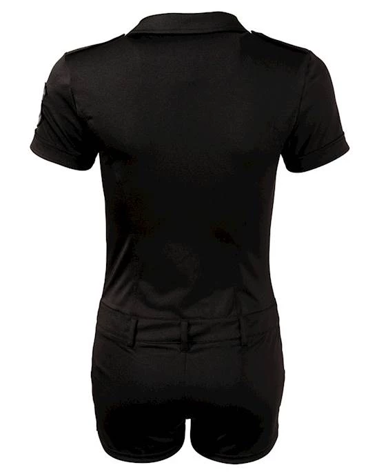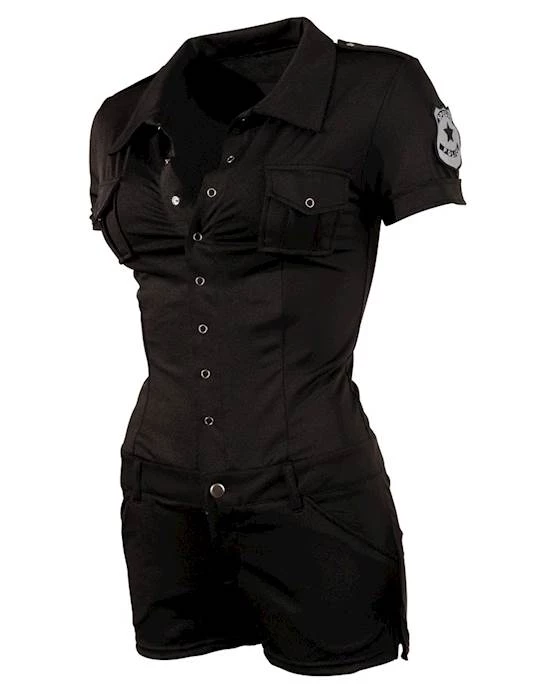 This sexy jump suit features short sleeves, breast pockets and a police badge. The stud buttons extend down the front of the jumpsuit allowing for easy access with things get steamy.